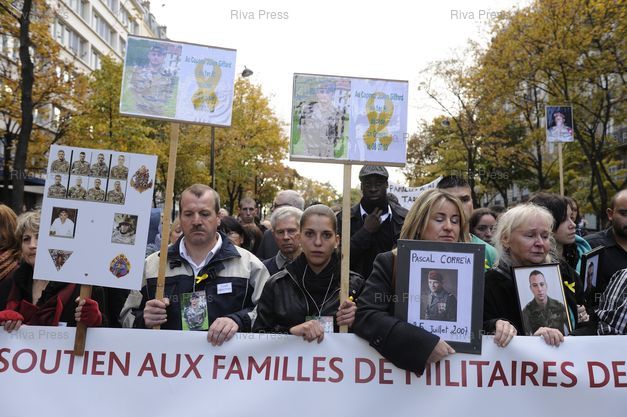 Légende : Marche silencieuse du Comité de soutien aux familles de militaires en France, en souvenir des soldats tombés en campagne (Liban, Cote d'Ivoire, ex-Yougoslavie , Tchad, et Afghanistan).