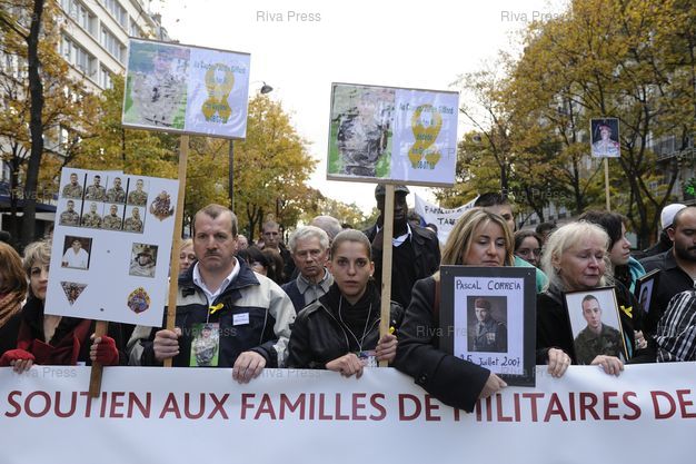 Légende : Marche silencieuse du Comité de soutien aux familles de militaires en France, en souvenir des soldats tombés en campagne (Liban, Cote d'Ivoire, ex-Yougoslavie , Tchad, et Afghanistan).