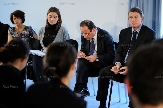 Caption : François Hollande rencontre les jeunes enseignants stagiaires du collectif "Stagiaire impossible" au Groupe scolaire Olympe de Gouges.