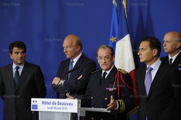 Légende : Brice Hortefeux, ministre de l'Interieur, Eric Besson, ministre de l'Immigration et Pierre Lellouche, secretaire d'Etat charge des affaires europeennes, s'expriment sur la mise en place des mesures d'evacuation de campements illicites lors d'une conférence de presse - Hotel de Beauvau.