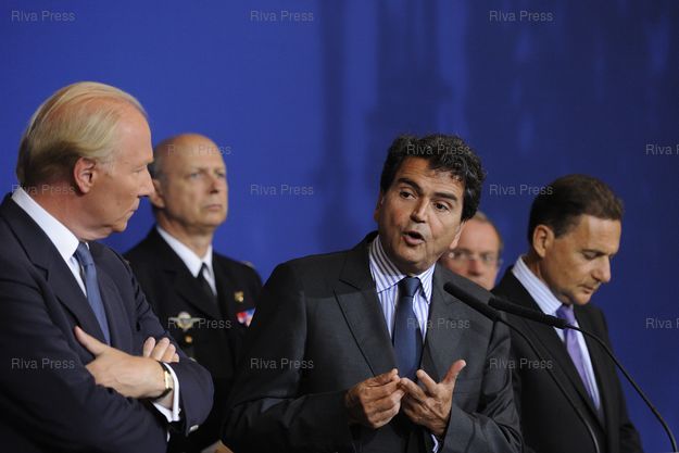Légende : Brice Hortefeux, ministre de l'Interieur, Eric Besson, ministre de l'Immigration et Pierre Lellouche, secretaire d'Etat charge des affaires europeennes, s'expriment sur la mise en place des mesures d'evacuation de campements illicites lors d'une conférence de presse - Hotel de Beauvau.