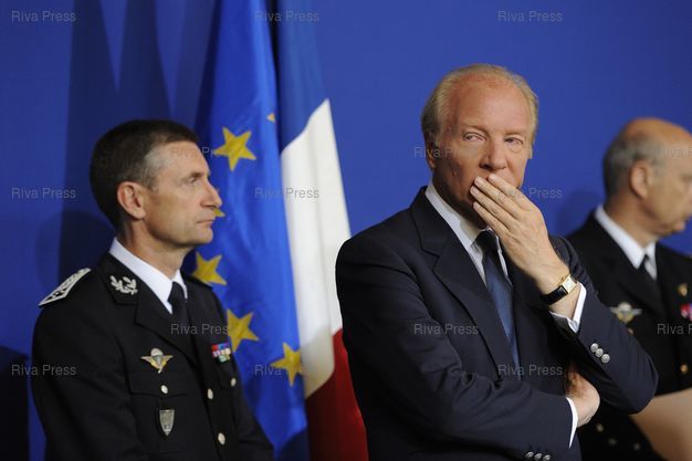 Légende : Brice Hortefeux, ministre de l'Interieur, Eric Besson, ministre de l'Immigration et Pierre Lellouche, secretaire d'Etat charge des affaires europeennes, s'expriment sur la mise en place des mesures d'evacuation de campements illicites lors d'une conférence de presse - Hotel de Beauvau.