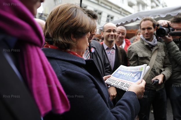 Légende : Martine Aubry en campagne au marche Sainte Lucie d'Issy-les-Moulineaux a la vieille du premier tour de la Primaire.