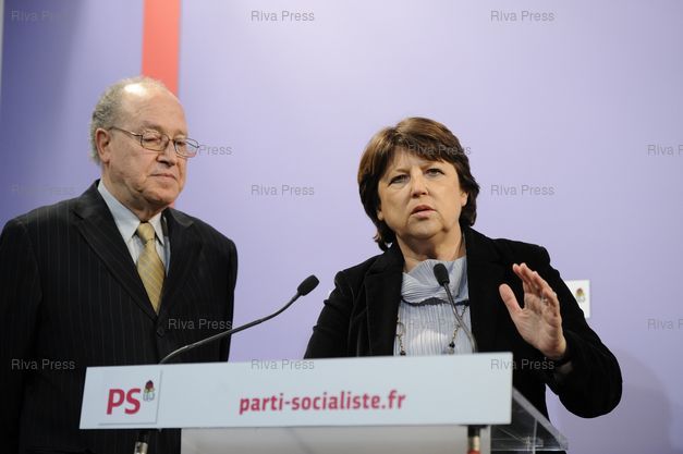 Légende : Martine Aubry et Mustapha Ben-Jaafar, secretaire general du Forum democratique pour le travail et les libertes de Tunisie, s'expriment a l'issue du Bureau National du Parti Socialiste.