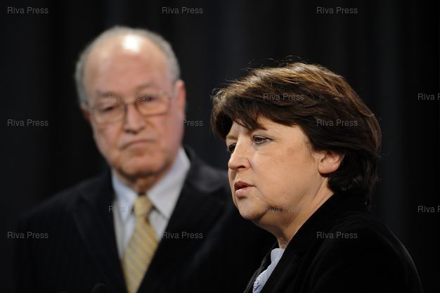 Légende : Martine Aubry et Mustapha Ben-Jaafar, secretaire general du Forum democratique pour le travail et les libertes de Tunisie, s'expriment a l'issue du Bureau National du Parti Socialiste.