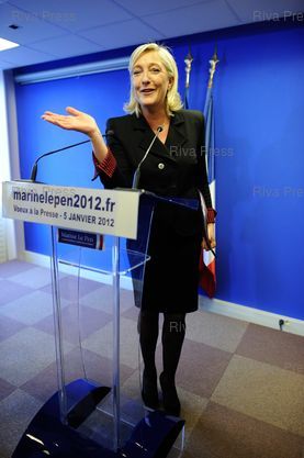 Légende : Marine Le Pen présente ses voeux à la Presse au siège du Front National.