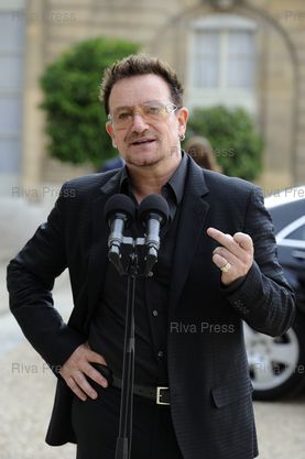 Légende : Bono is received by french president Nicolas Sarkozy at the Elysee Palace, to prepare the UN summit in New York.