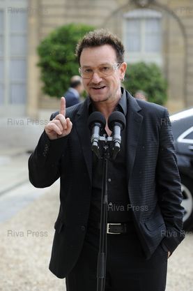 Légende : Bono is received by french president Nicolas Sarkozy at the Elysee Palace, to prepare the UN summit in New York.
