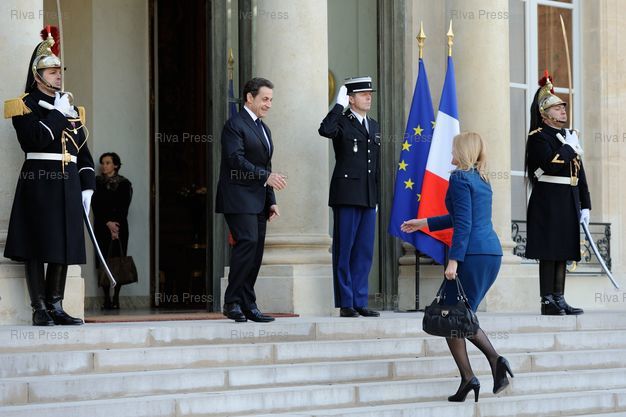 Légende : Nicolas Sarkozy receives Helle Thorning-Schmidt, prime minister of Denmark, at the Elysée Palace.