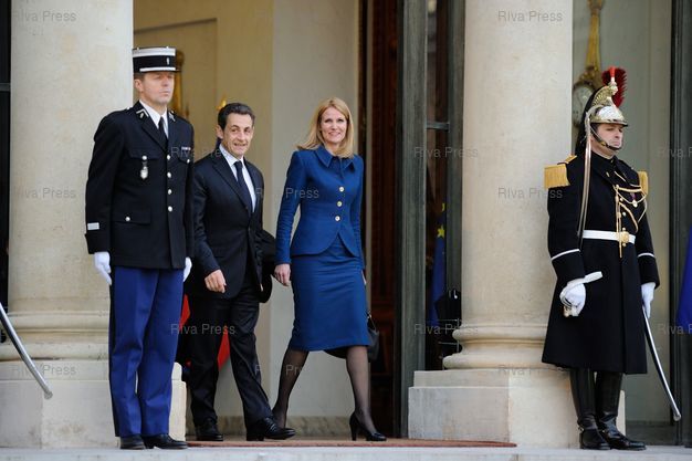 Légende : Nicolas Sarkozy receives Helle Thorning-Schmidt, prime minister of Denmark, at the Elysée Palace.