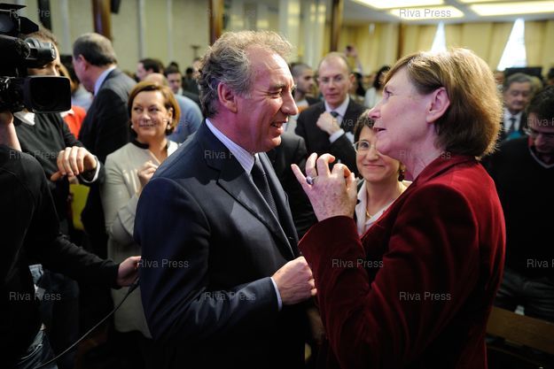 Légende : François Bayrou confronte son projet et ses orientations pour les questions institutionnelles, de Justice, de Sécurité, du rôle des médias et associations en France avec des acteurs de terrain, spécialistes et praticiens de ces questions, dans le cadre de l'agenda 2012-2020 - Maison de la Chimie.
