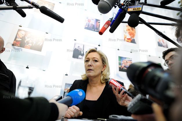 Marine Le Pen fait un point presse au stand des Brasseurs de France, devant une galerie de photos de politiques en visite au salon - Photo © Lionel Préau +33 (0)6 68 12 83 77