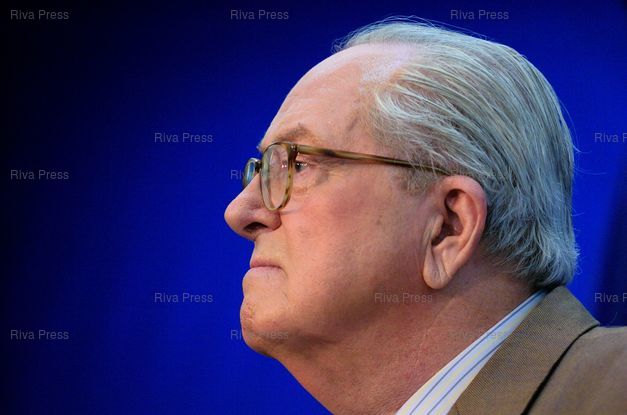 Légende : Jean-Marie Le Pen, président du Front National, présente les grandes lignes de son projet présidentiel lors d'une conférence de presse.
