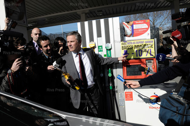 Point presse de Nicolas Dupont-Aignan devant une pompe à essence - Photo © Lionel Préau +33 (0)6 68 12 83 77