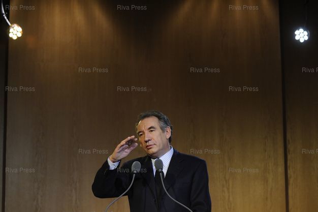 Légende : Francois Bayrou, president du Mouvement democrate, presente ses voeux a la Presse au siège du mouvement.