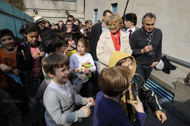 Légende : Eva Joly, candidate d'Europe Ecologie-Les Verts à la présidentielle, visite l'école Saint-Merri-Renard - Paris - 13/04/2012 - Photo © Lionel Préau +33 (0)6 68 12 83 77