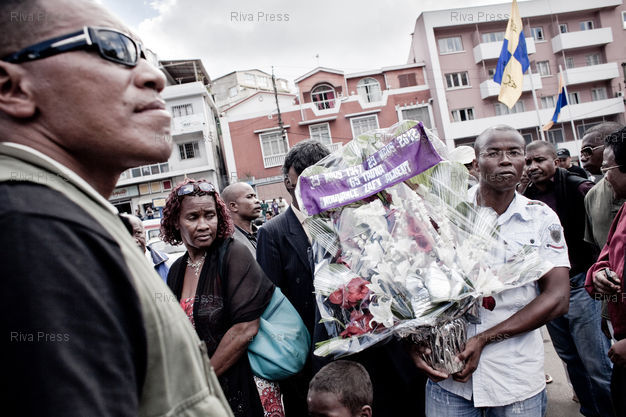 Légende : 29/03/2012 - Antananarivo, MADAGASCAR - Albert ZAFY, ancien président de Madagascar de 1993 à 1996, et ses partisans déposent une gerbe de fleurs en commémoration des évènements du 29 mars 1947 où une révolte a éclaté contre le colonisateur et violemment réprimée par l'armée française. PHOTO : RIJASOLO / RIVA PRESS