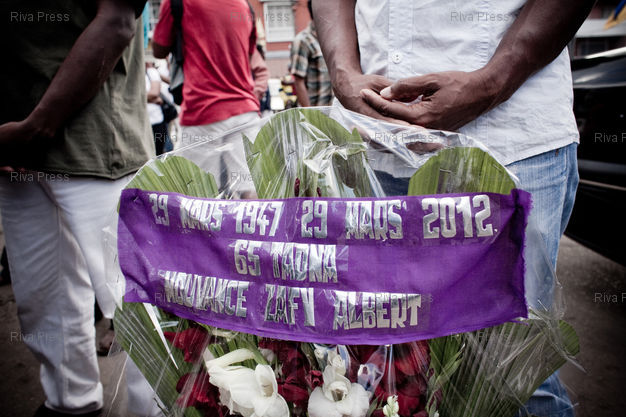 Légende : 29/03/2012 - Antananarivo, MADAGASCAR - Albert ZAFY, ancien président de Madagascar de 1993 à 1996, et ses partisans déposent une gerbe de fleurs en commémoration des évènements du 29 mars 1947 où une révolte a éclaté contre le colonisateur et violemment réprimée par l'armée française. PHOTO : RIJASOLO / RIVA PRESS
