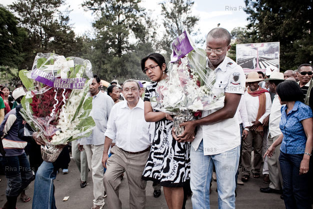 Légende : 29/03/2012 - Antananarivo, MADAGASCAR - Albert ZAFY, ancien président de Madagascar de 1993 à 1996, et ses partisans déposent une gerbe de fleurs en commémoration des évènements du 29 mars 1947 où une révolte a éclaté contre le colonisateur et violemment réprimée par l'armée française. PHOTO : RIJASOLO / RIVA PRESS