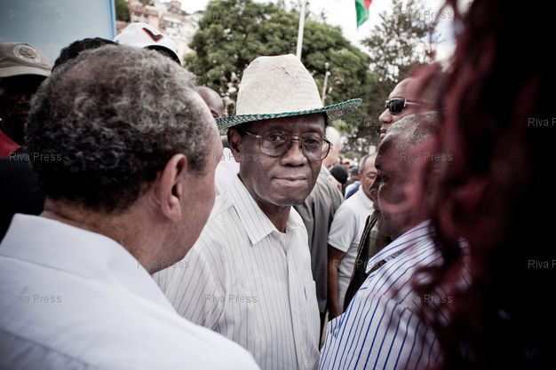 Légende : 29/03/2012 - Antananarivo, MADAGASCAR - Albert ZAFY (C avec chapeau de paille), ancien président de Madagascar de 1993 à 1996, et ses partisans déposent une gerbe de fleurs en commémoration des évènements du 29 mars 1947 où une révolte a éclaté contre le colonisateur et violemment réprimée par l'armée française. PHOTO : RIJASOLO / RIVA PRESS