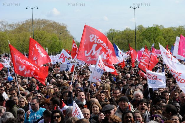 Légende : Meeting de François Hollande, candidat du Parti Socialiste à l'élection présidentielle, sur l'esplanade du Château de Vincennes.