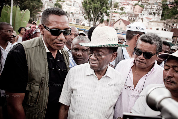 Légende : 29/03/2012 - Antananarivo, MADAGASCAR - Albert ZAFY (C avec chapeau de paille), ancien président de Madagascar de 1993 à 1996, et ses partisans déposent une gerbe de fleurs en commémoration des évènements du 29 mars 1947 où une révolte a éclaté contre le colonisateur et violemment réprimée par l'armée française. PHOTO : RIJASOLO / RIVA PRESS