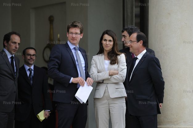 François Hollande échange avec Aurélie Filippetti, ministre de la Culture et de la Communication et Pascal Canfin, ministre délégué au Développement pendant que Roméo Langlois répond aux questions des journalistes - Photo © Lionel Préau +33 (0)6 68 12 83 77