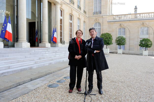 Jean-Luc Mélenchon et Martine Billard s'expriment devant la presse après l'entrevue avec François Hollande - Photo © Lionel Préau +33 (0)6 68 12 83 77