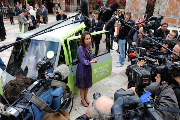 Légende : Ségolène Royal présente en avant-première du Mondial de l'Automobile des prototypes de véhicules électriques à bas coût créés par des industriels de sa région.