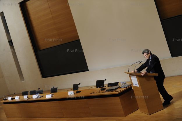 Légende : S.A.S. Prince Albert II de Monaco et Jean-Louis Borloo participent au colloque de cloture de la 4eme annee polaire internationale - College de France.