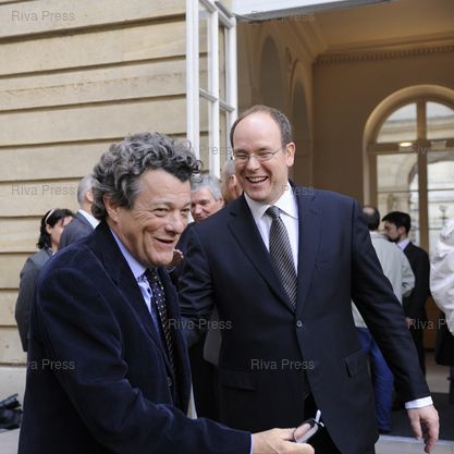 Légende : S.A.S. Prince Albert II de Monaco et Jean-Louis Borloo participent au colloque de cloture de la 4eme annee polaire internationale - College de France.