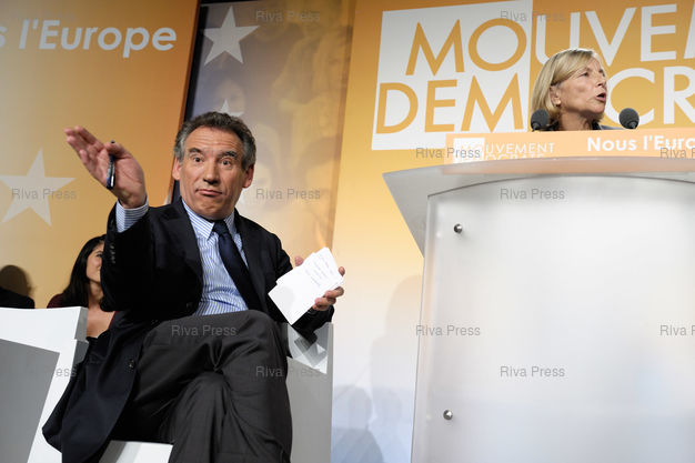 Légende : Meeting de campagne du Mouvement Démocrate (Modem) avant le scrutin du 7 juin pour les élections européennes - Maison de la Mutualité.