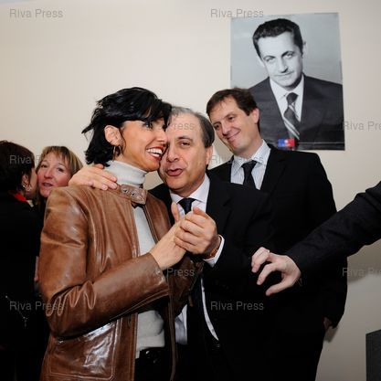 Roger Karoutchi embrasse Rachida Dati en présence de Jerome Chartier et devant un portrait de Nicolas Sarkozy - Photo © Lionel Préau +33 (0)6 68 12 83 77