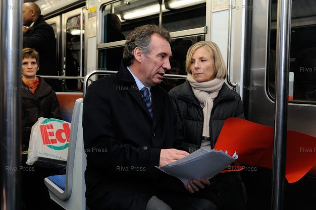 François Bayrou et Marielle de Sarnez, tête de liste du Modem à Paris, dans le métro entre le XIIème et le VIVème arrondissements - Photo © Lionel Préau +33 (0)6 68 12 83 77