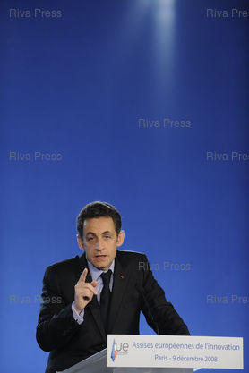 Légende : Nicolas Sarkozy clôture les Assises européennes de l'innovation à la Cité des Sciences et de l'Industrie - Paris - 09/12/2008 - Photo © Lionel Préau +33 (0)6 68 12 83 77