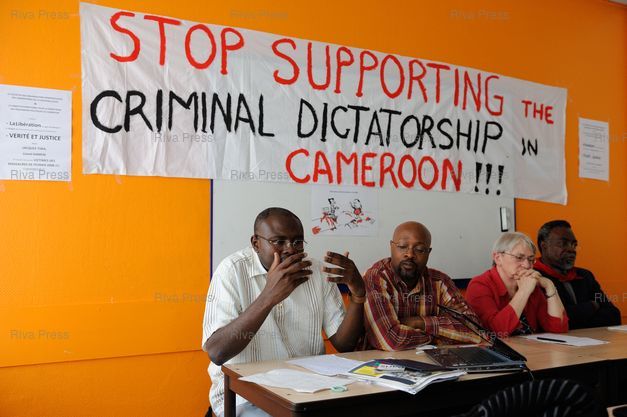 Légende : Conférence de presse du CODE (Collectiff des Organisations Democratiques et Patriotiques de la Diaspora Camerounaise) et de l'association Survie a l'occasion de la visite en France du president de la republique du Cameroun Paul Biya.
