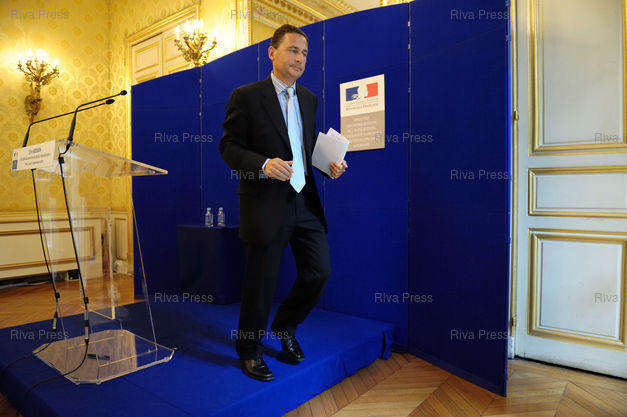 Légende : Eric Besson, Ministre de l'immigration, de l'intégration, de l'identité nationale et du développement solidaire, présente le bilan de son ministère 6 mois après sa prise de fonction lors d'une conférence de presse au ministère.