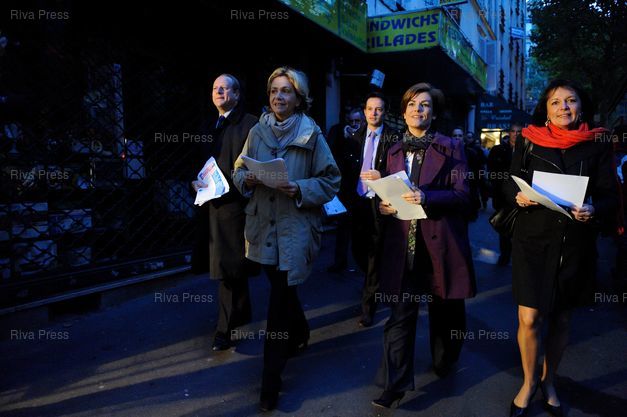 Légende : Valerie Pecresse, chef de file UMP pour les regionales en Ile-de-France, et Chantal Jouanno, tête de liste pour les regionales a Paris se rejoignent au Cafe La Fourche Royale av. de Clichy pour une distribution de tracts.