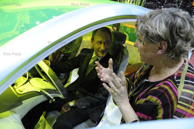 Légende : Bertrand Delanoe visite le Mondial de l'Automobile, en particulier les véhicules électriques.
