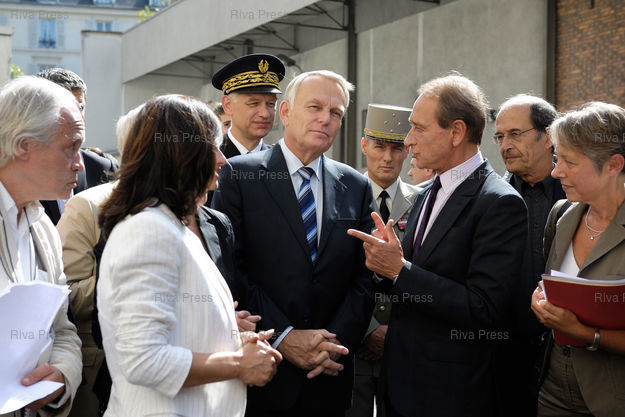 Légende : Jean-Marc Ayrault se rend à la caserne de Reuilly, dans le cadre de la construction de logements, accompagné de Cécile Duflot, Ministre de l'Egalité des Territoires et du Logement, et de Bertrand Delanoë, Maire de Paris.