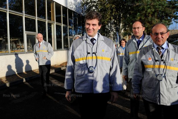 Légende : Arnaud Montebourg, Ministre du Redressement Productif, visite l'usine de production de moteurs Renault de Cléon (Seine Maritime), à la veille de l'ouverture du Mondial de l'Automobile.