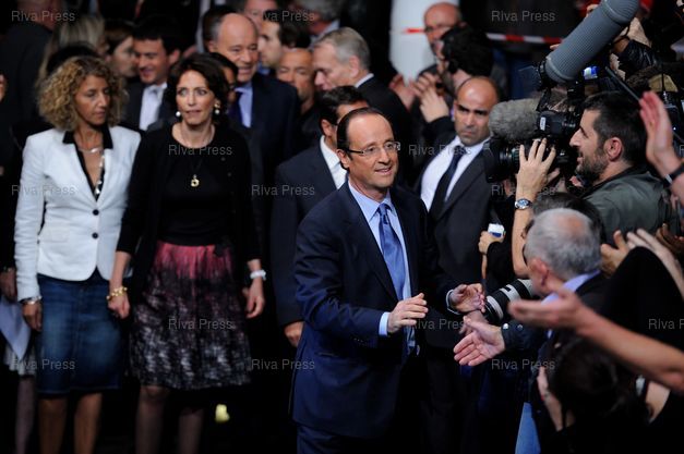 Légende : Meeting de campagne de Francois Hollande au Bataclan pour la primaire du Parti Socialiste qui l'oppose a Martine Aubry au deuxieme tour.