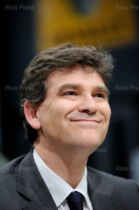 Légende : Arnaud Montebourg, Ministre du Redressement Productif, visite l'usine de production véhicules Renault à Maubeuge.