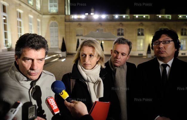 Pascal Durand - Barbara Pompili - François de Rugy - Jean-Vincent Placé, répondent aux questions des journalistes après leur entretien avec François Hollande - Paris - 28/11/2012 - Photo © Lionel Préau +33 (0)6 68 12 83 77