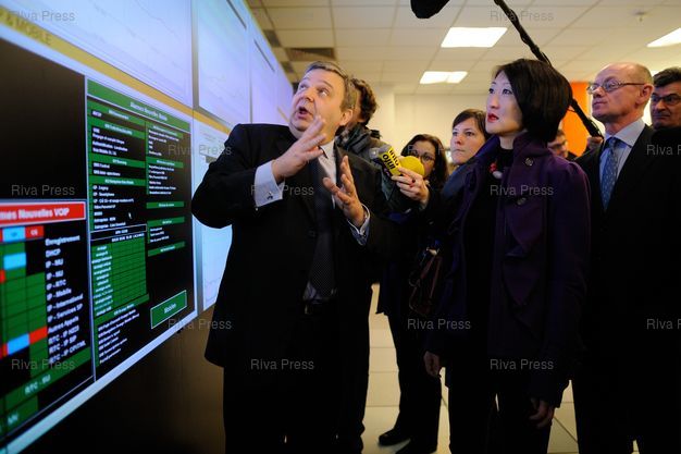 Légende : Fleur Pellerin, ministre déléguée auprès du ministre du Redressement productif, chargée des Petites et Moyennes Entreprises, de l'Innovation et de l'Economie numérique, se rend au Centre de Surveillance d'Orange pour "saluer le travail des salariés, à travers eux, l'ensemble des français mobilisés en ce jour de Saint-Sylvestre dans leurs entreprises, publiques ou privées, afin d'assurer la continuité des services" - Paris - 31/12/2012 - Photo © Lionel Préau +33 (0)6 68 12 83 77