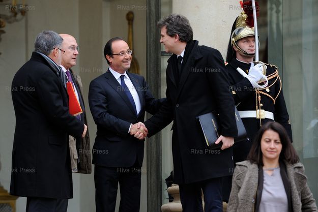 François Hollande salue les ministres sur le perron à l'issue du déjeuner, ici Arnaud Montebourg, en présence de Alain Vidalies, Michel Sapin, Cécile Duflot - Paris - 03/01/2013 - Photo © Lionel Préau +33 (0)6 68 12 83 77