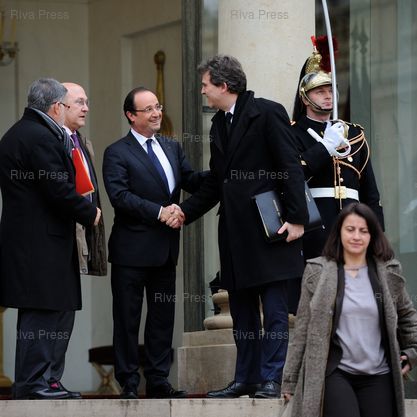 François Hollande salue les ministres sur le perron à l'issue du déjeuner, ici Arnaud Montebourg, en présence de Alain Vidalies, Michel Sapin, Cécile Duflot - Paris - 03/01/2013 - Photo © Lionel Préau +33 (0)6 68 12 83 77