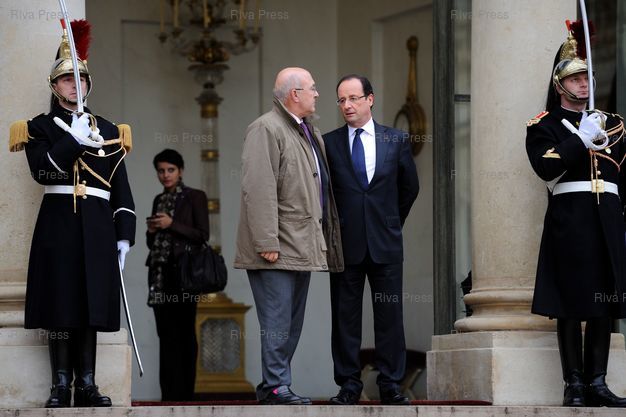 François Hollande salue les ministres sur le perron à l'issue du déjeuner, et échange longuement avec Michel Sapin - Paris - 03/01/2013 - Photo © Lionel Préau +33 (0)6 68 12 83 77