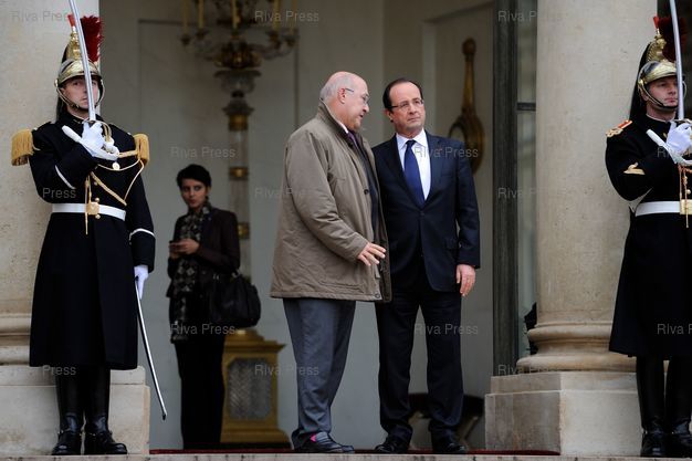 François Hollande salue les ministres sur le perron à l'issue du déjeuner, et échange longuement avec Michel Sapin - Paris - 03/01/2013 - Photo © Lionel Préau +33 (0)6 68 12 83 77