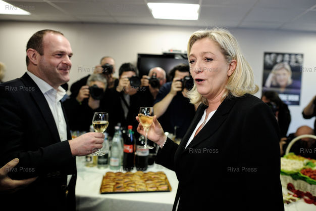 Marine Le Pen et Steeve Briois, coupe de champagne en main devant les photographes derrière le buffet - Nanterre - 08/01/2013 - Photo © Lionel Préau +33 (0)6 68 12 83 77
